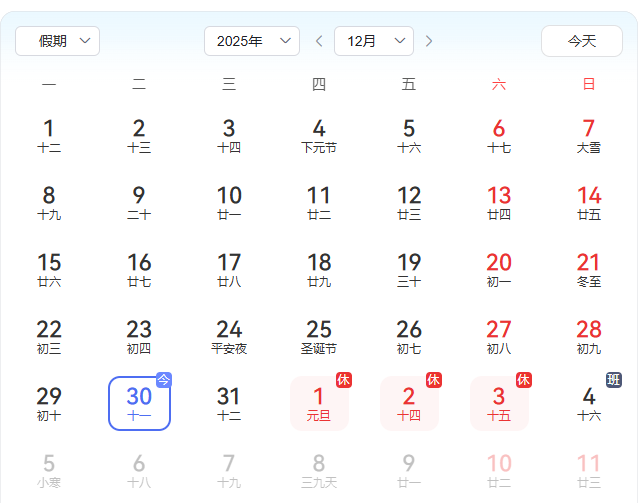 为便于您合理安排业务对接,现将公司元旦放假安排告知如下:2026年1月1日(周四)至1月3日(周六)放假调休,共计3天,1月4日(周日)恢复正常运营及业务办理。